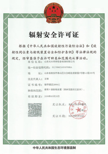 山東光大特種設備檢測有限公司是經山東省市場監督管理局核準的甲類B1特種設備綜合檢驗機構。2017年9月30日取得了山東省市場監督管理局頒發的《檢驗檢測機構資質認定證書》。2018年2月22日取得了山東省市場監督管理局頒發的《特種設備檢驗檢測機構核準證》(起重機械)檢驗檢測資質。2021年11月取得山東省市場監督管理局版發的《特種設備檢驗檢測機構核準證》(安全閥在線、離線)校驗資質。2023年11月取得山東省市場監督管理局頒發的甲類檢驗機構B1《特種設備檢驗檢測機構核準證》,具有壓力容器(RD2...